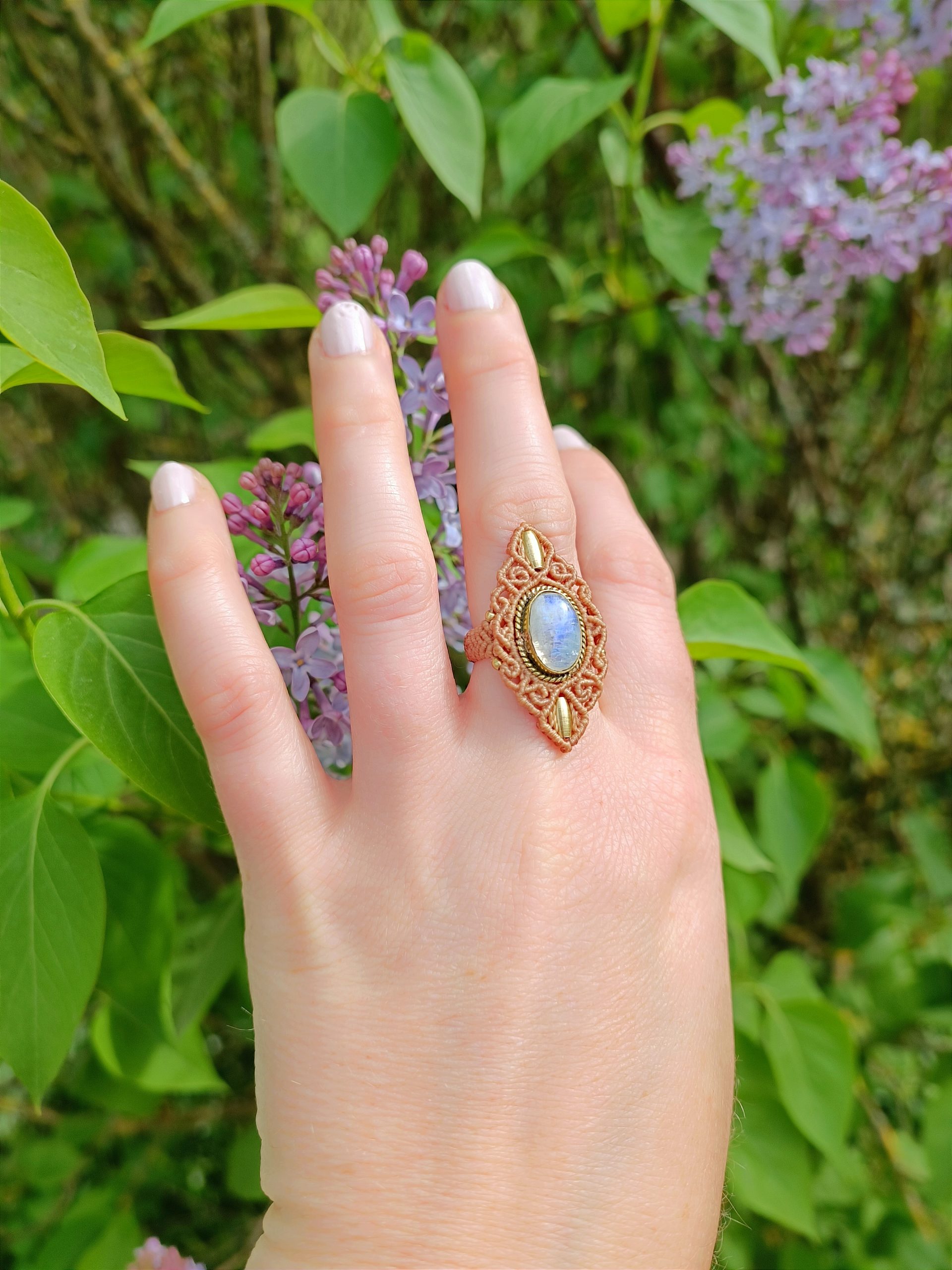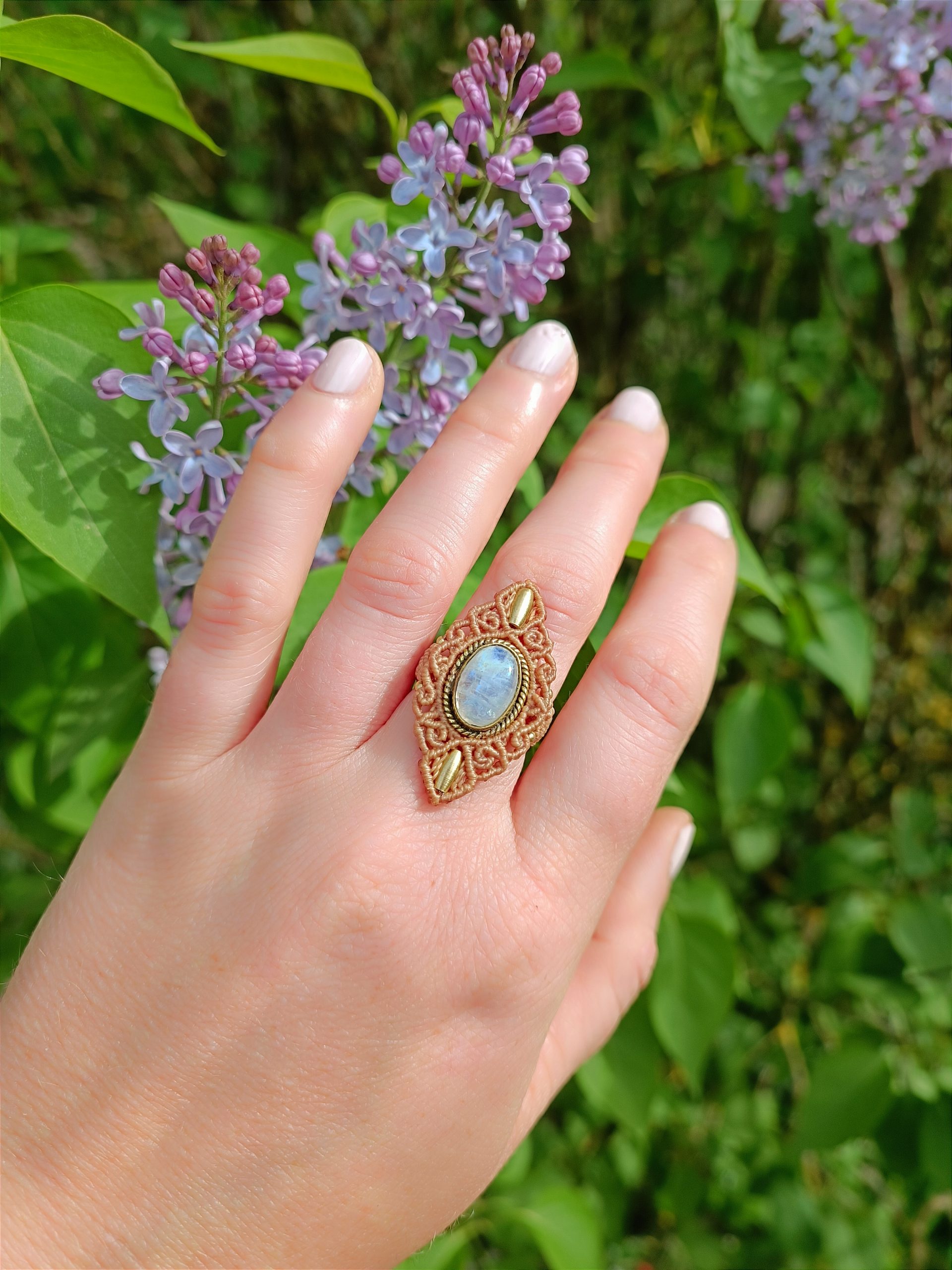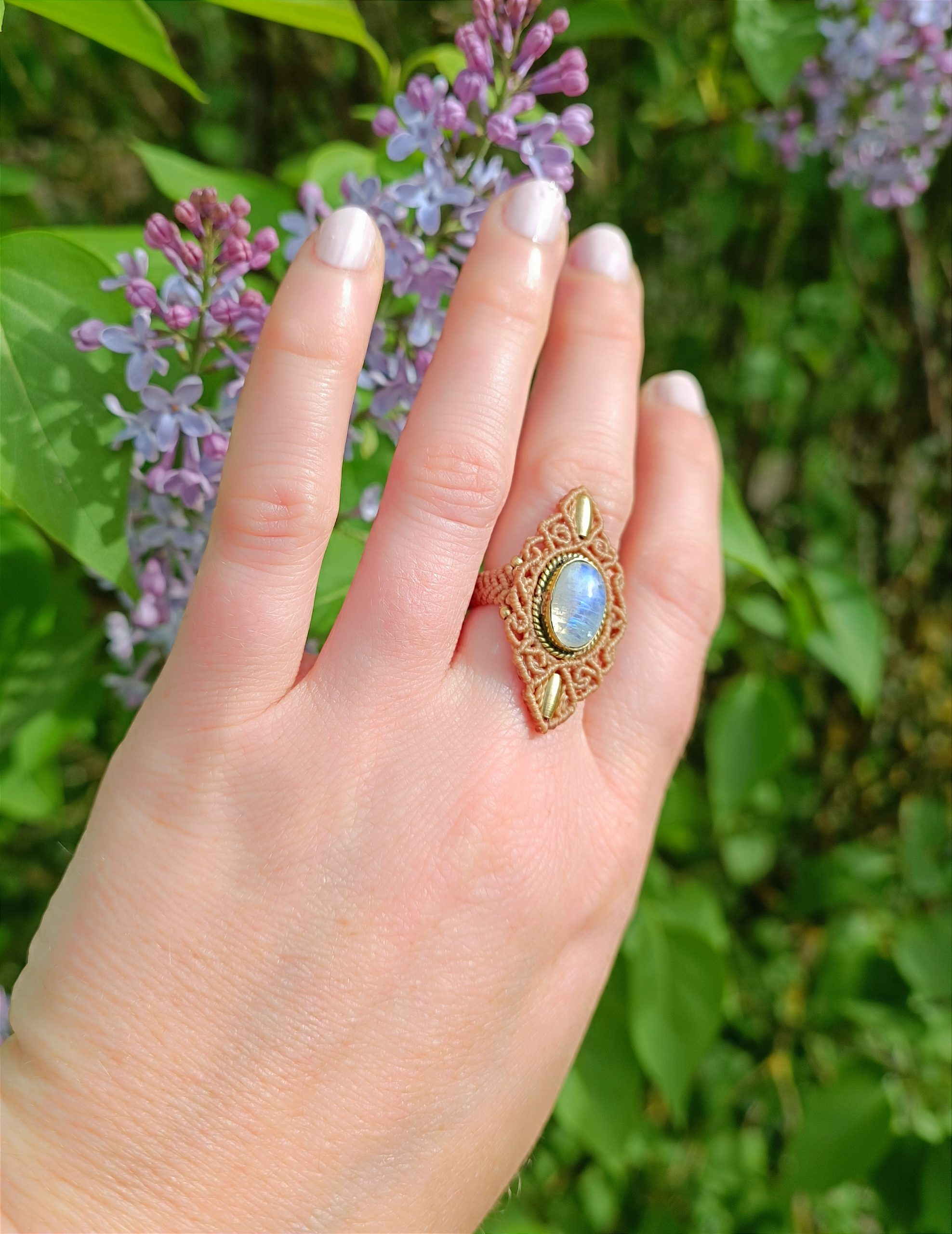Bague avec un magnifique cabochon de pierre de lune aux reflets bleu, serti de laiton et perles de laiton