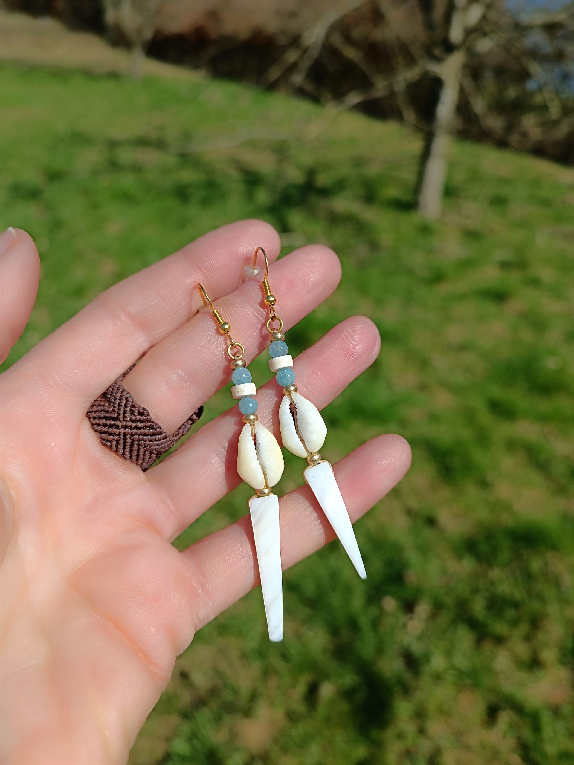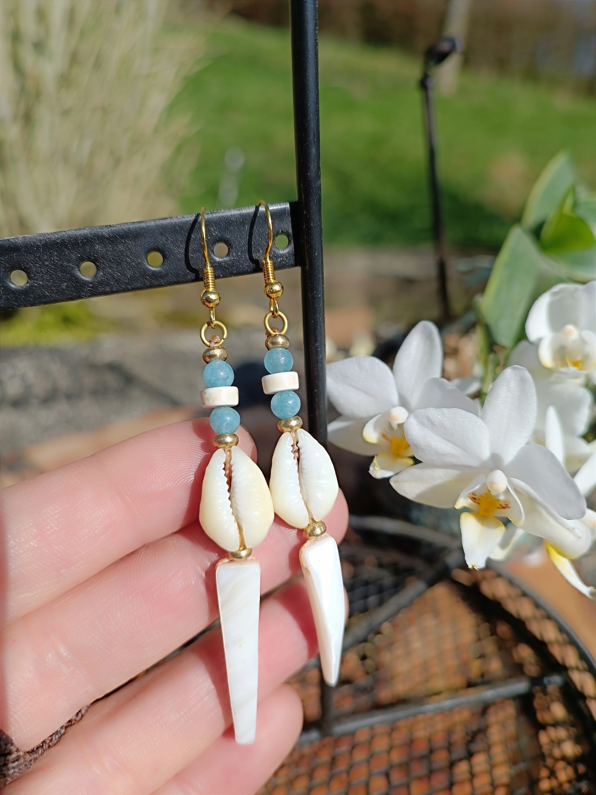 Boucles d’oreilles coquillages cauris, perles d’aigue marine, perles plate en os de yack, perles en laiton doré et pendentif en coquillage.