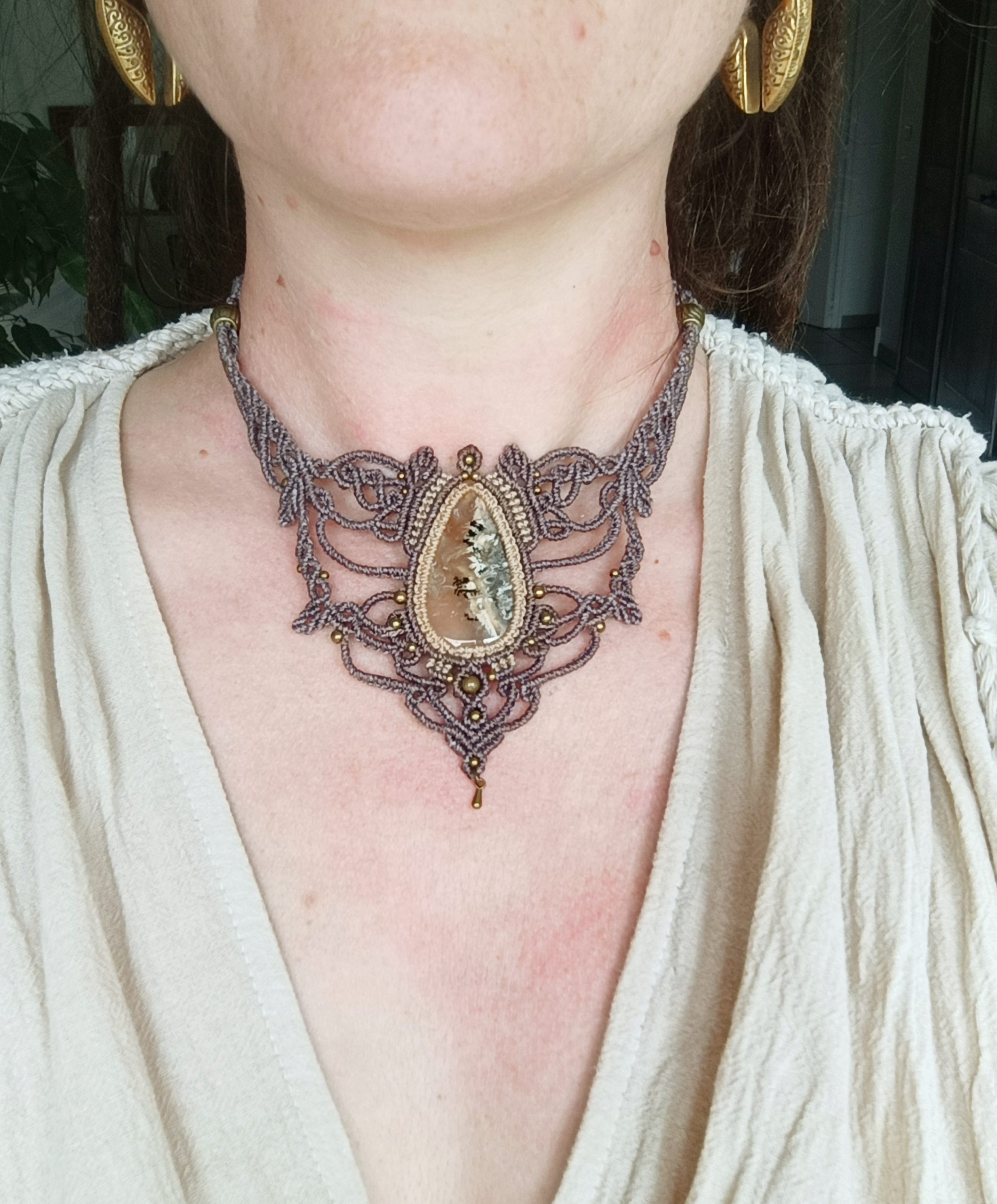 Collier réglable avec une pierre d’Agate dendritique et perles de laiton