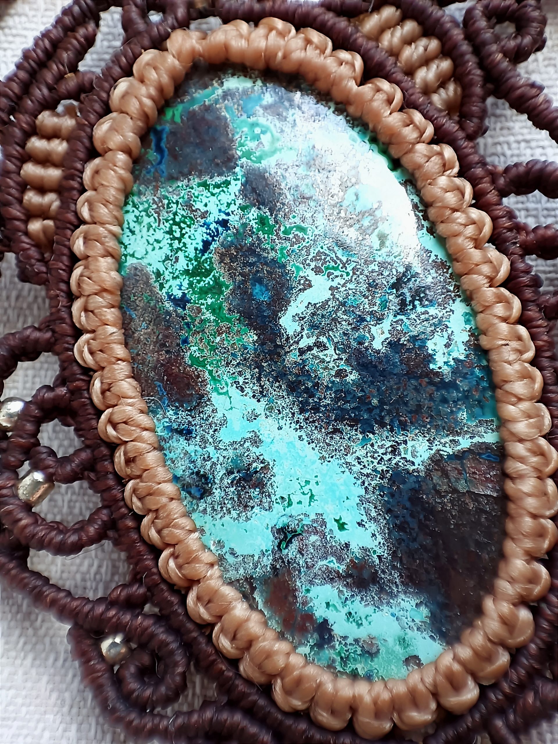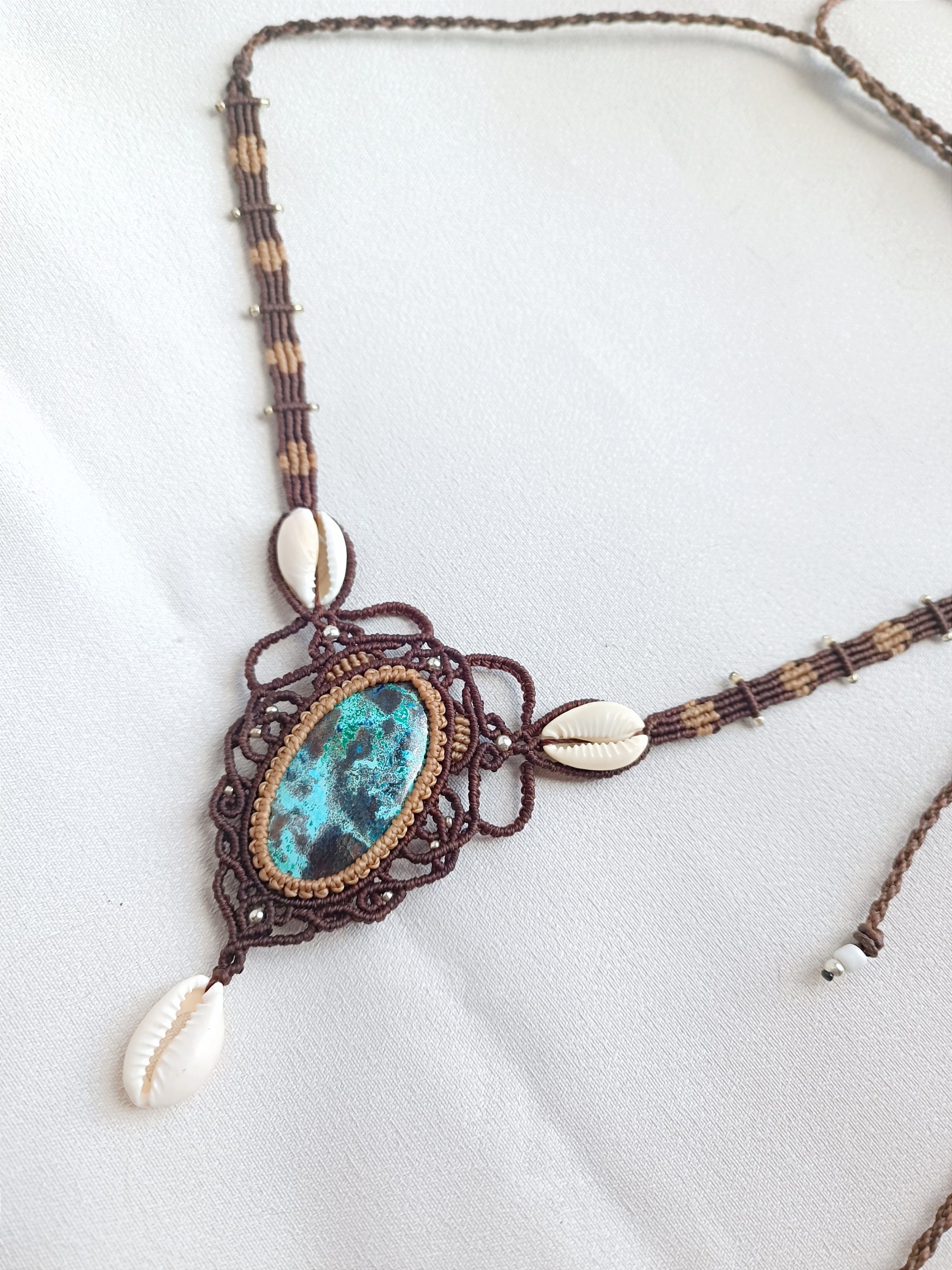 Collier réglable avec un magnifique cabochon d’azurite et des coquillages cauris, un vrai lagon vu du ciel